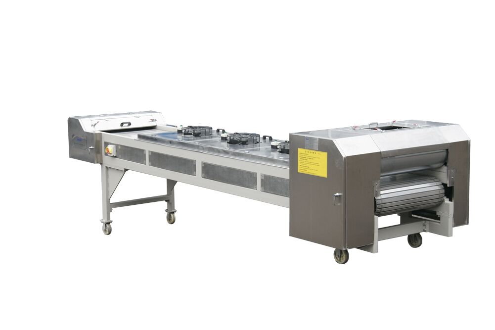 不銹鋼帶冷卻壓片機(jī)由壓輥、不銹鋼鏈板、破碎輥和行走機(jī)構(gòu)組成。擠出機(jī)擠出的熱熔狀態(tài)物料經(jīng)壓輥壓成1-1.5mm厚的帶狀物。壓輥采用水冷卻。物料在輸送過程中用吹風(fēng)機(jī)吹風(fēng),繼續(xù)將物料冷卻成固態(tài),破碎成片狀物料落入料斗。
